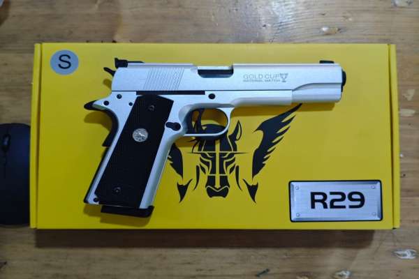 Army Armament R29 MK IV Cold Cup National Match GBB Pistol (Silver) 1:1 Ratio realistic gas blow back airsoft pistol Gas Blow Back Pistol with Semi-Automatic Shooting Mode Metal Slide Engraved “GOLD CUP” Marking on Slide Metal Frame Metal Outer Barrel (Black Color) Metal Front Sight and Adjustable Rear Sight Metal recoil spring rod With Classic non-slip grip Cover Metal trigger, magazine release, Slide Catch, Hammer & Grip Safety (Black Color) Metal 26 Rounds gLoading Capacity Gas Magazine
