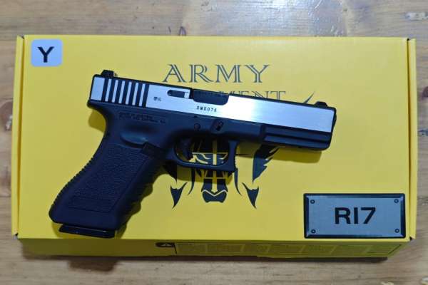 Brand: Army Armament Model Name: R17-Y Colour: Black with Silver Top Slide Scale: 1:1 Magazine: 24 Round Metal Mag (Can Use TM Mags) Measured velocity: 270 Fps Hop-Up: Fully Adjustable Fire mode: GBB Barrel type: Metal Standard Bore (~100mm) Weight: 760 Length: Around 188mm Approximate Range: 45 m BlowBack: Yes Calibre: 6 mm Fire Mode: safe/semi-auto Variant: GBB Hop-Up: Yes Adjustable Inner Barrel Length: 97 mm Magazine Capacity: 25 BB Muzzle velocity specified by the manufacturer: 300 fps Propellant: GreenGas Recommended BB Pellets: 0.20g - 0.25g