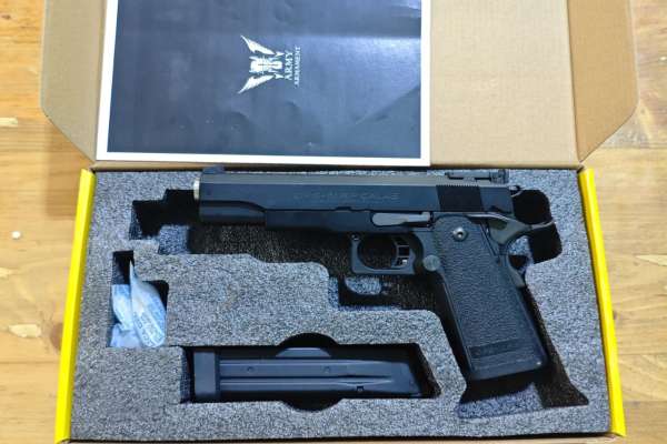 Manufacturer: Army Armament SKU: ARMY-R616-2 Features: Upgraded steel Hammer, Sear, Disconnector, Valve knocker, Fire pin lock Specification: Main Material : Aluminum, Metal Alloy, Polymer Magazine Capacity : 30 Rounds 6mm BB Overall Length : 230mm Inner Barrel Length : 85mm Weight : 970g System : Gas Blowback, Adjustable Hop-Up Power Source : Top / Green Gas Fire Mode : Semi-Auto / Safety Muzzle Velocity : Approx. 300-320 Fps with 0.2G BB