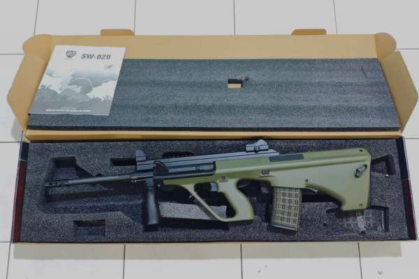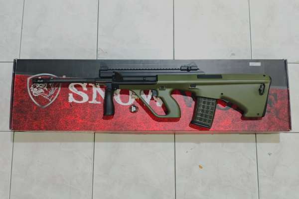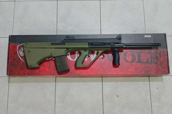 Specifications: Length: 795mm Barrel Length: 500mm Weight: 3076g (with magazine) Color: Black, Tan Material: Metal, Plastic Hop-up: Adjustable Shooting Mode: Safety, Semi-Auto, Full-Auto Magazine Capacity: 330 Rounds Bullet Type: 6mm BB Battery: 9.6V Battery (mini type plug) Power(Muzzle Velocity): 420 FPS (0.2g BB) Manufacturer: Snow Wolf The AUG (Armee-Universal-Gewehr in German, Universal Army Rifle in English) is an Austrian Bullpup 5.56mm assault rilfe designed by Steyr Mannlicher GmbH in 1960s. It was adopted by the Austrian Army as model StG 77 in 1978 as a replacement of StG 58 (Austrian licenced made FN FAL). F88 Austeyr, an Australian licenced made AUG, is a service rifle of Australian Army. Features: ‧Comes with Metal upper receiver with Plastic XS Type 20mm Picatinny top rail ‧Comes with Plastic one-piece lower receiver with grip and stock ‧Comes with Metal outer barrel with flash hider (14mm CCW) ‧Comes with Plastic folding vertical front grip ‧Comes with Plastic detachable front and rear sight ‧Comes with Plastic charging handle and bolt carrier plate ‧Comes with Plastic trigger, selector, magazine release and receiver lock ‧Comes with Steel front and rear sling swivels ‧Package includes Plastic 330 rounds hi-cap magazine